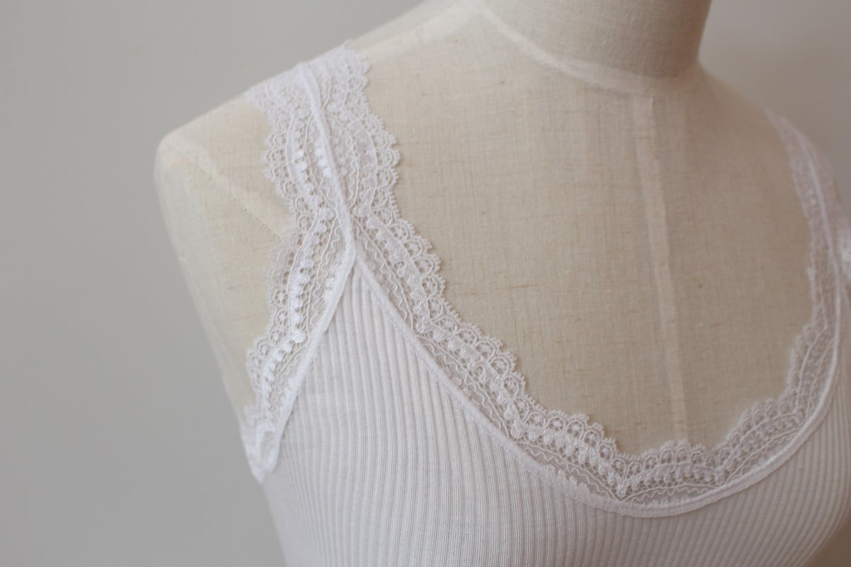 Oscalito定番のレースタンクトップ。最高級のイタリアンコットン100%を使ったオスカリートのタンクトップ。リブ素材およびサイドシームレスで身体に自然にフィットし、寒い時も暑いときも大活躍です!胸元から肩へつながるレースがとてもエレガントに魅せます。丈の長さもしっかりとあるので、インして着ていただけ、背中が気になりません。丈のカットもウェイビーカットになっているため、インナーをみせるスタイルにもあいます。胸元のレースは世界最高級のフランスカレー地区で織られたリバーレースを使用しています。