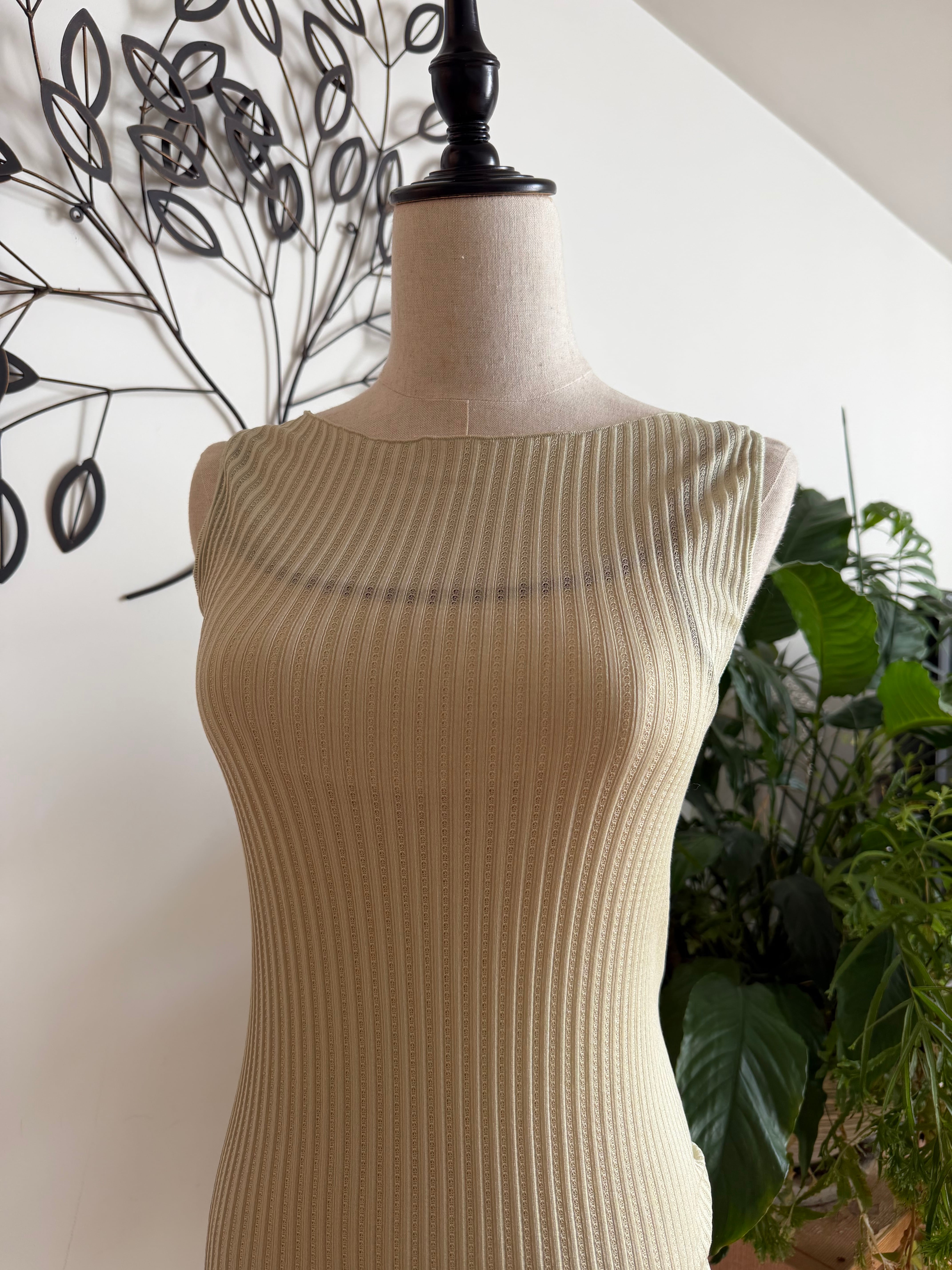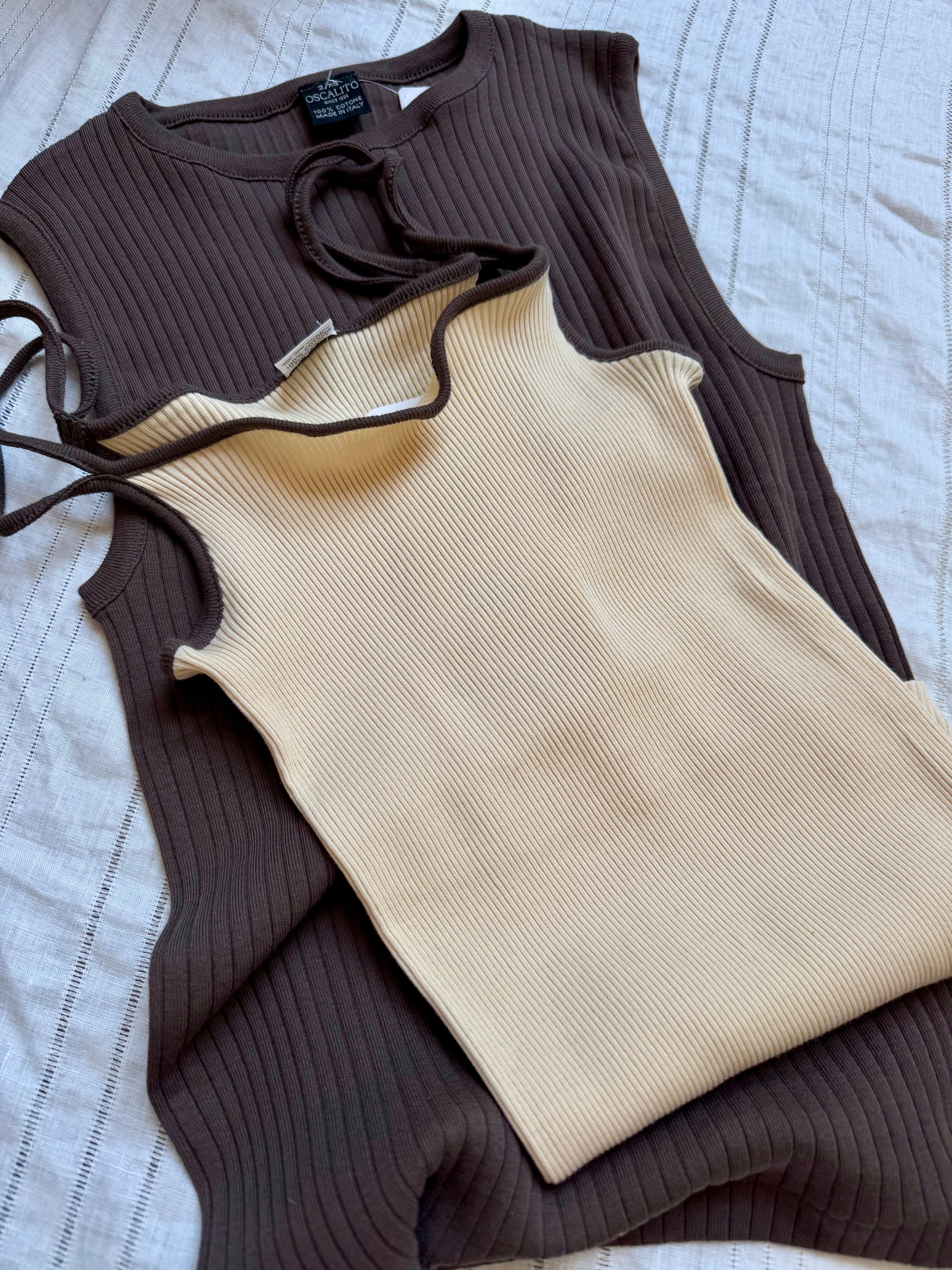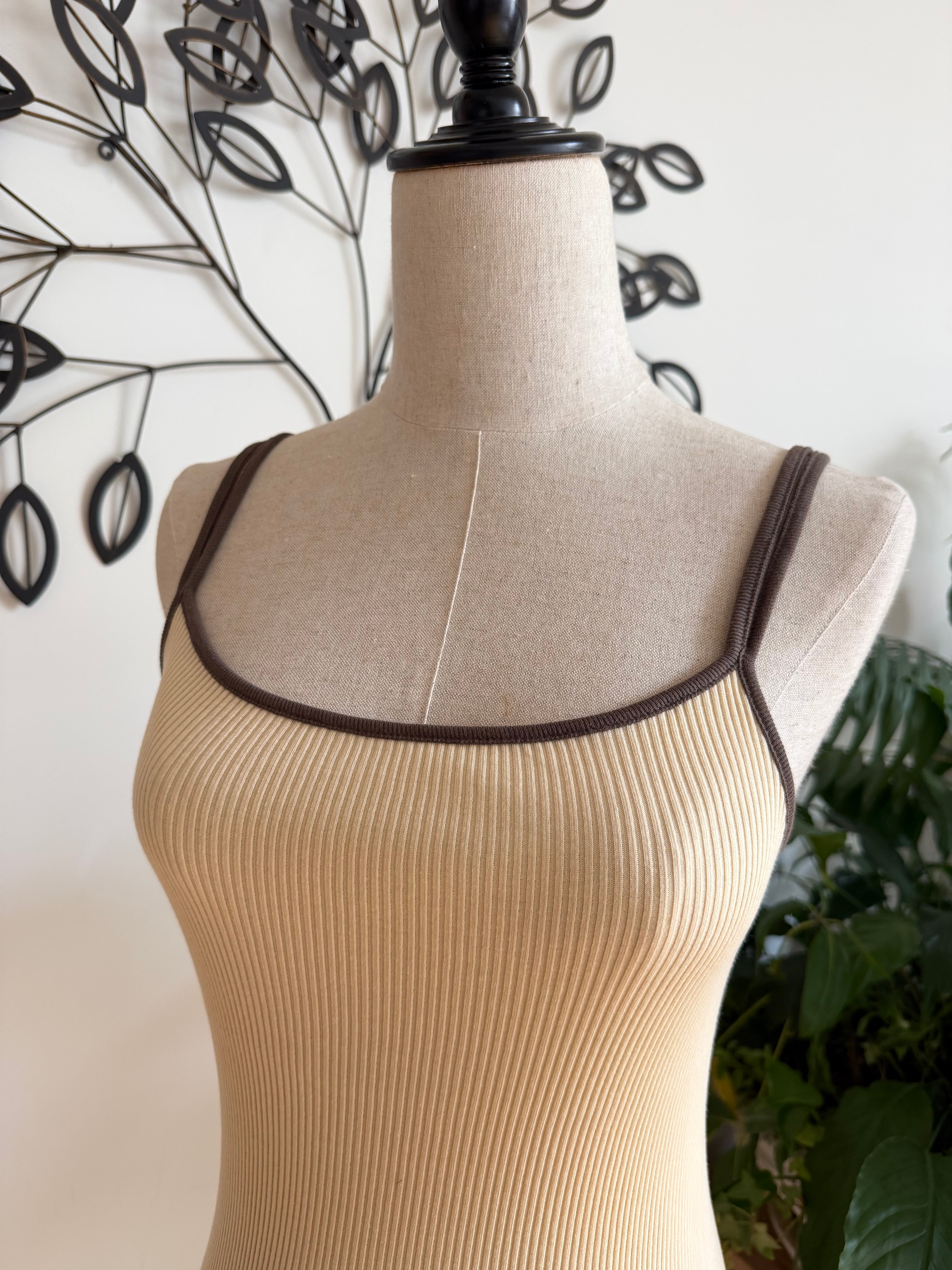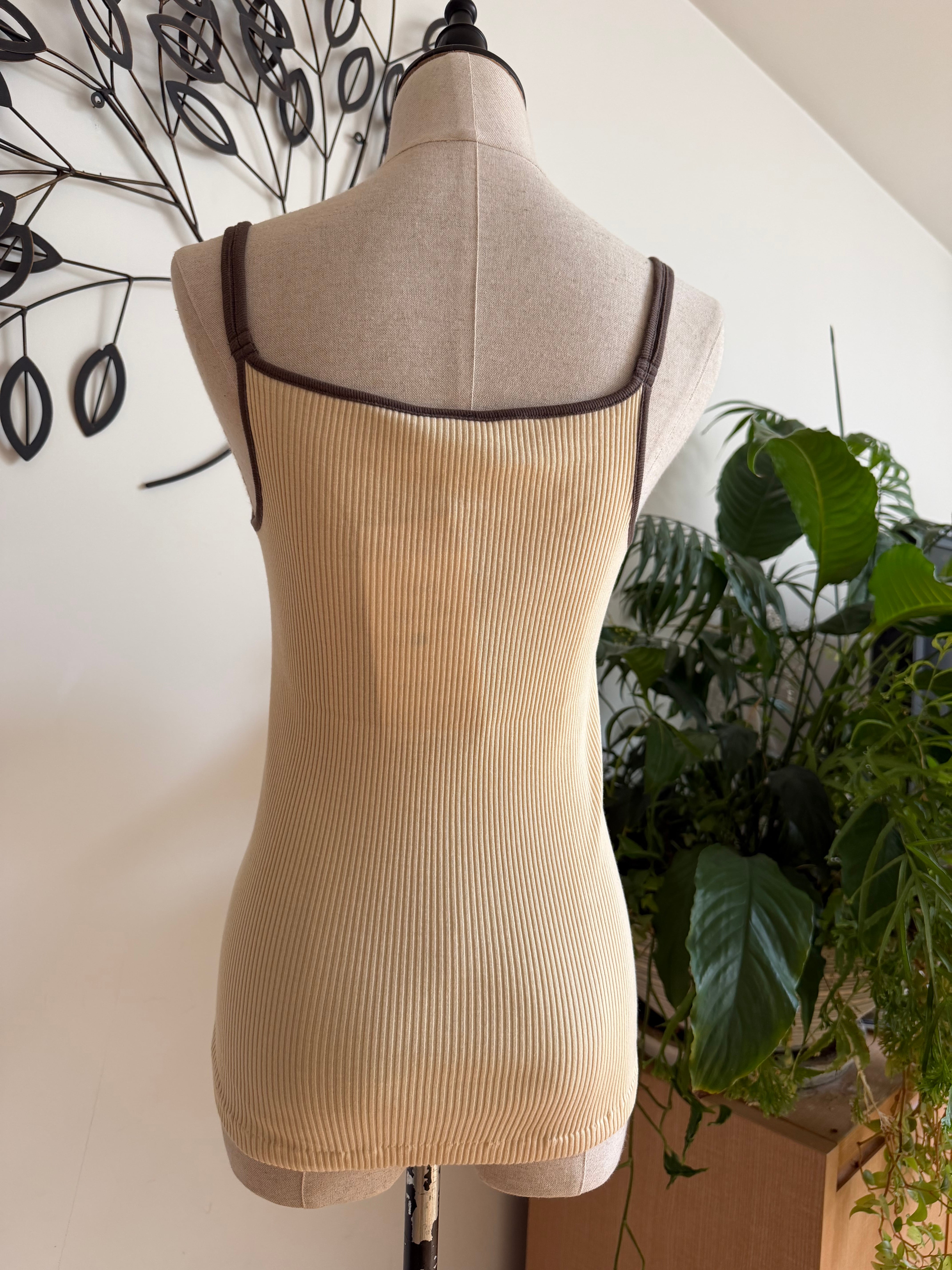 パイピング使いのタンクトップ。シンプルなお洋服を着たときでも首元がポイントになります。